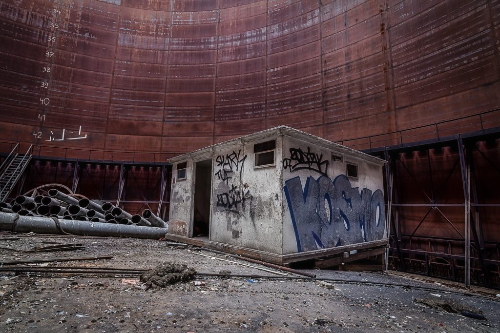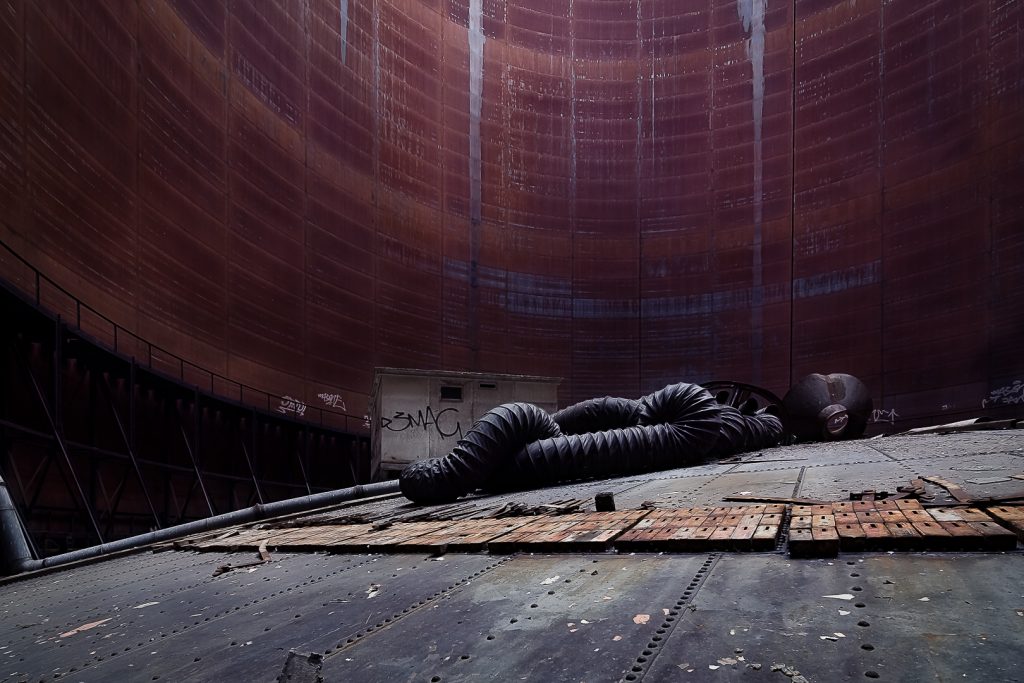 Hier haben wir das seltene Vergnügen, ein sogenanntes Gasometer von innen zu sehen. Bei diesem Gasometer handelt es sich um einen Scheibengasbehälter mit einem Fassungsvermögen von mehr als 100000 m³ Volumen.